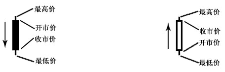 阴柱表明下跌,即收市价低于开市价,阳柱表明上涨,即收市价高于开市价。 下面两条边是该时间段的开盘价和收盘价,实体上部和下部的垂直线影线分别代表该时间段的最高价和最低价。